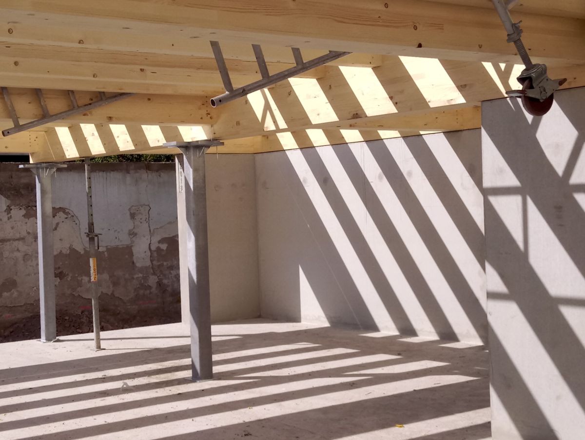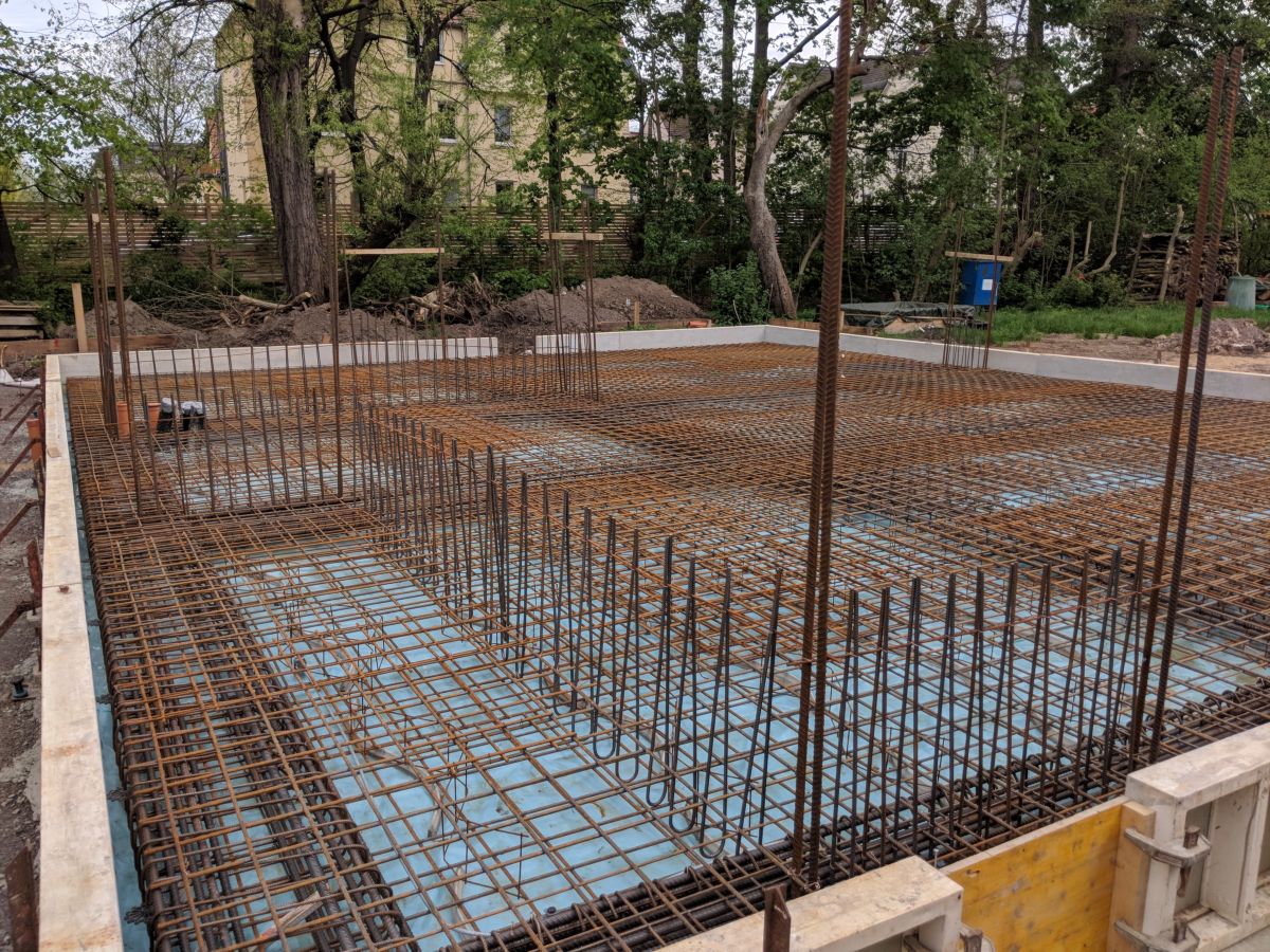 Ein Grundgedanke bei der Planung war, die Dinge so zu ergreifen, wie sie sind. Die Stahlstützen sind aus Stahl, die Betonscheiben sind sichtbarer Beton. Stützen und Scheiben stehen auf einer Bodenplatte aus Stahlbeton und ergänzen sich statisch optimal. Die Bodenplatte schwimmt flächig auf dem weichen Untergrund, sodass eine tiefgreifenden Gründung vermieden werden konnte. Auf den Stützen lasten drei große Balken, welche die Aufteilung des Hauses bis zum Dach hoch vorgeben und dessen Hauptlast tragen. Der Baukörper besteht sichtbar aus Holz.
