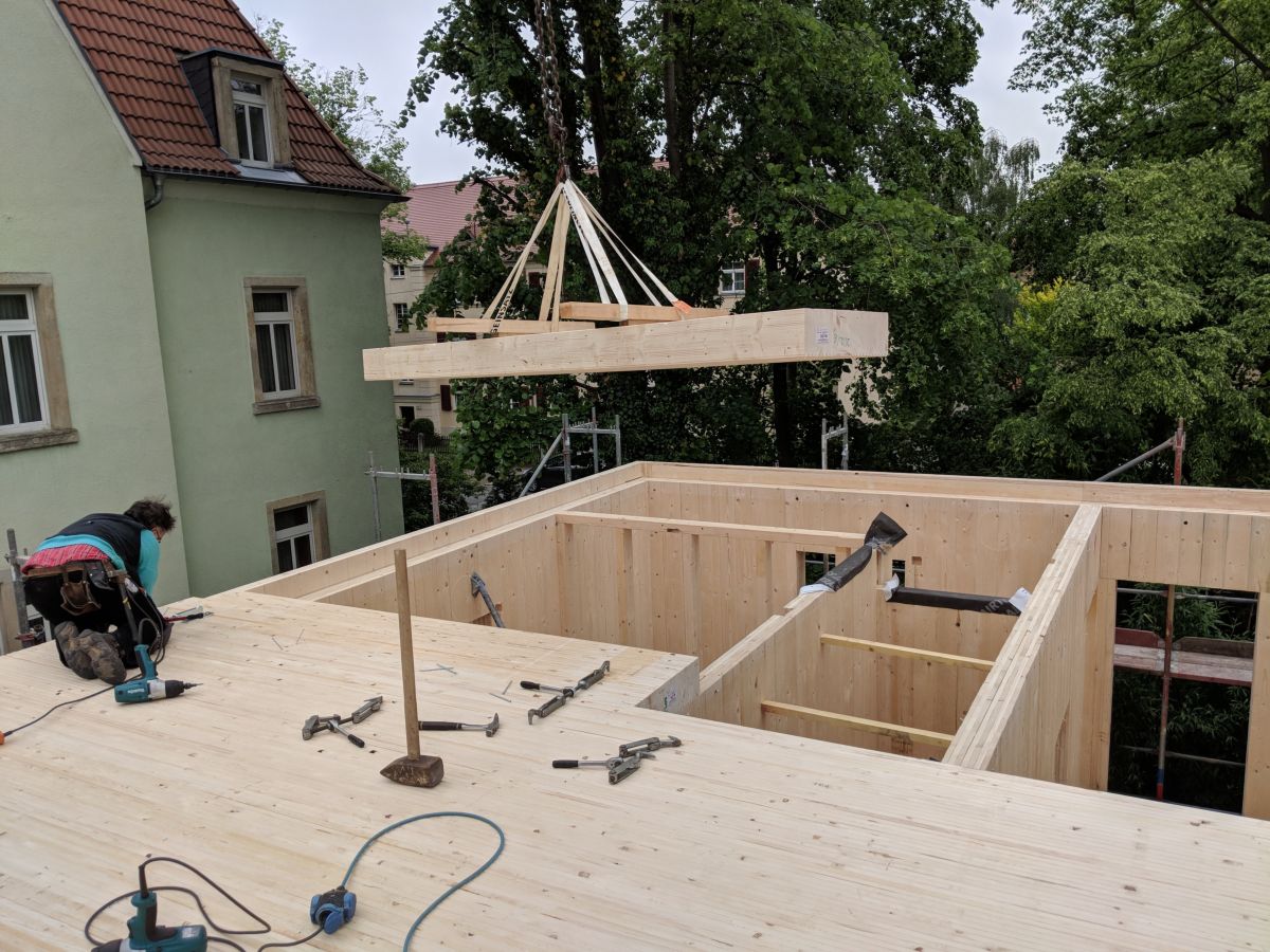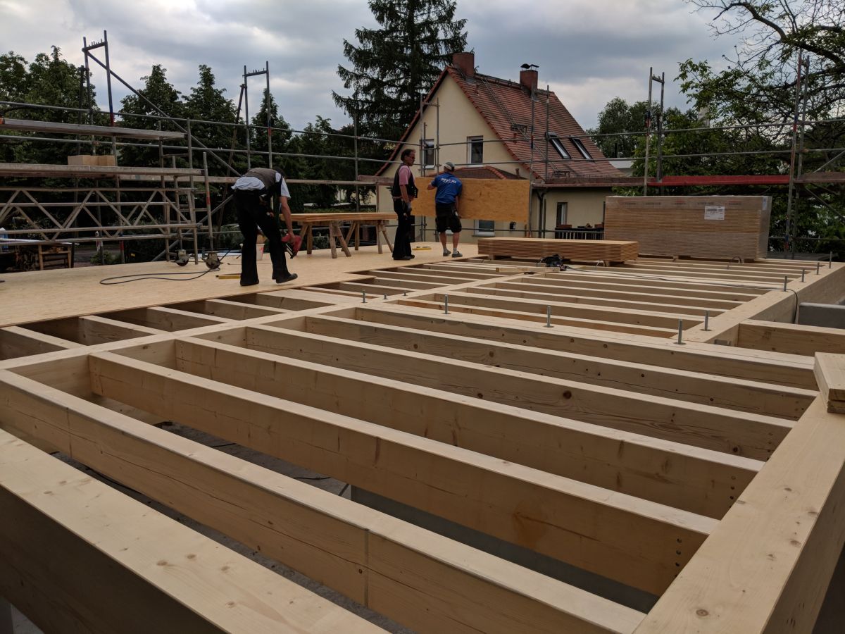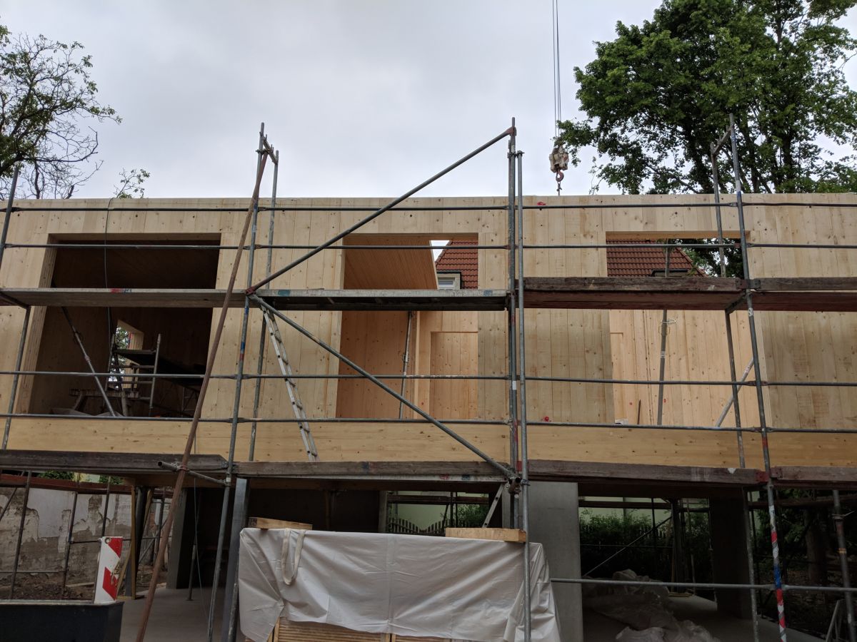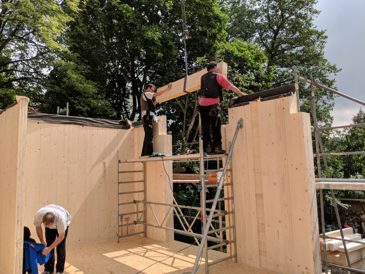 Der Holzbau ist schon heute im digitalen Zeitalter angekommen.Speziell die MHM-Platten werden durch einen großen Roboter Brett für Brett vollautomatisch zusammen getackert, sozusagen das Äquivalent zum 3D-Druck. Im Anschluss läuft die Platte einen Arbeitsplatz weiter, zu einer große CNC-Fräse, welche aus den Platten passende Bauteile inklusive aller Fenster, Türen und Installationsschlitze zurecht schneidet. Diese Bauteile werden software-gestützt derart verladen, dass sie auf der Baustelle hinter einander weg verbaut werden können und der LKW beim Entladen nicht umkippt. Das zusammensetzten der Bauteile geht, dank einer Toleranz von ±2 mm, rasend schnell. Die Formgebung des Gebäudes ist nahezu frei, es gibt kein Rastermaß o.ä. und die Planung findet komplett in der CAD-Software statt.