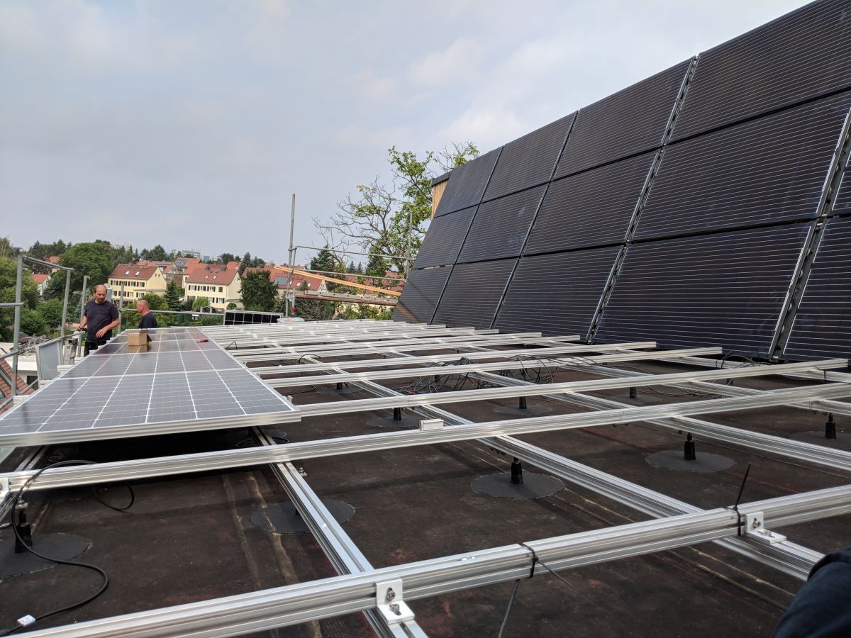 Die Anlage besteht aus 15 Solink PVT Hybridkollektoren (je 340 Wp) und 28 Heckert NeMo M 60 300 Modulen (je 300 Wp).Die Gesamtleistung beträgt 13,500 kWp. Der Azimut der Anlage beträgt 15°. Der Neigungswinkel der PVT Kollektoren beträgt 80°, die anderen 28 Module haben einen Neigungswinkel von 6°.