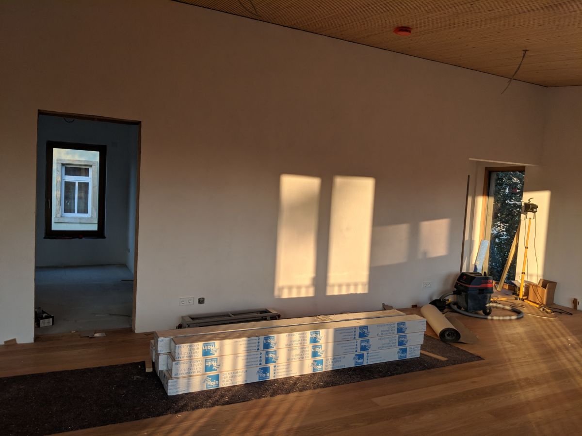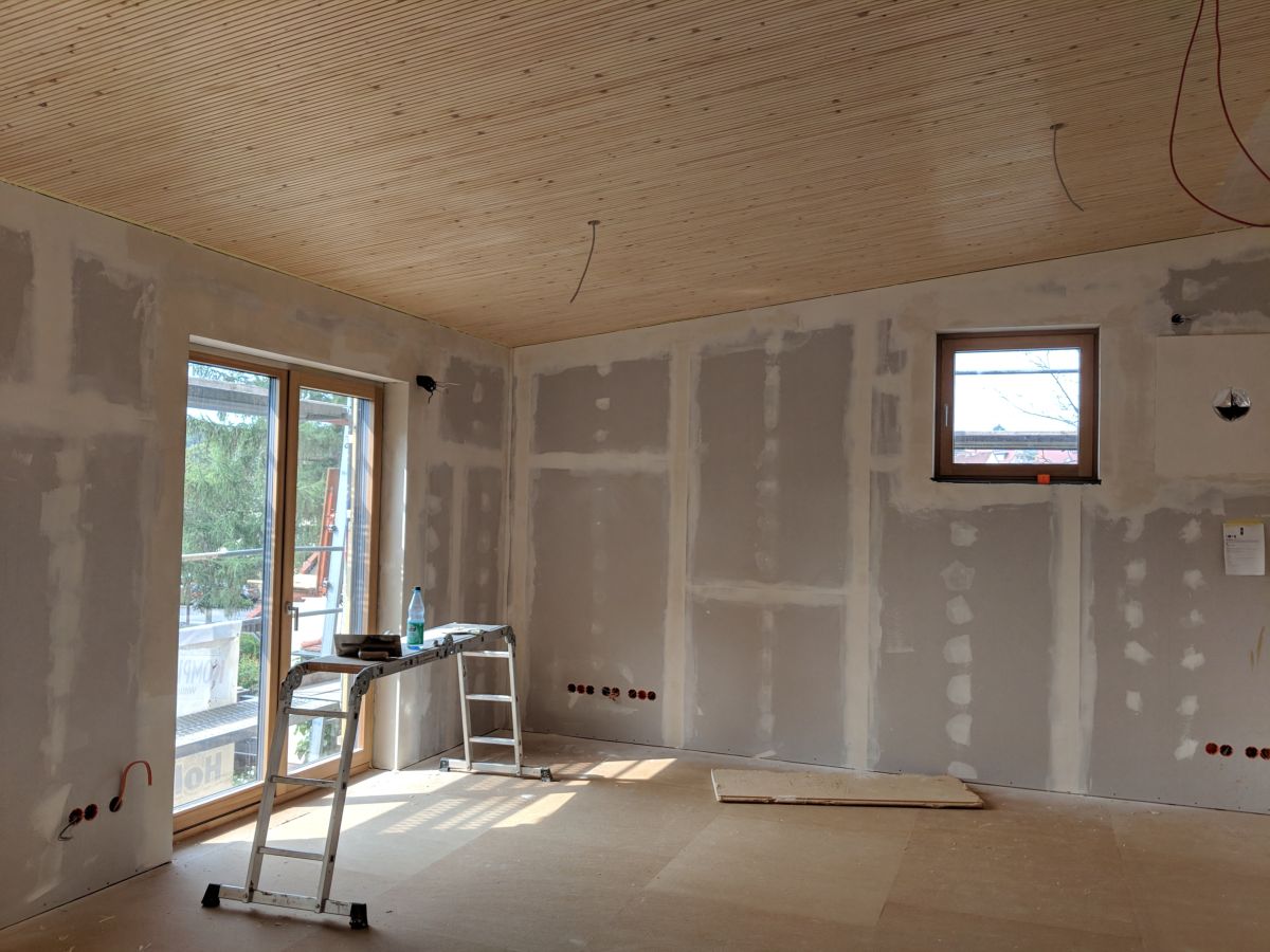 Im Innenbereich sind die massiven Holzwände, welche auch die nötige Installation aufnehmen, mit Plattenmaterialien wie Gipskarton oder Lehmplatten verkleidet. An einzelnen Stellen wurde die rohe Holzwand gelassen.