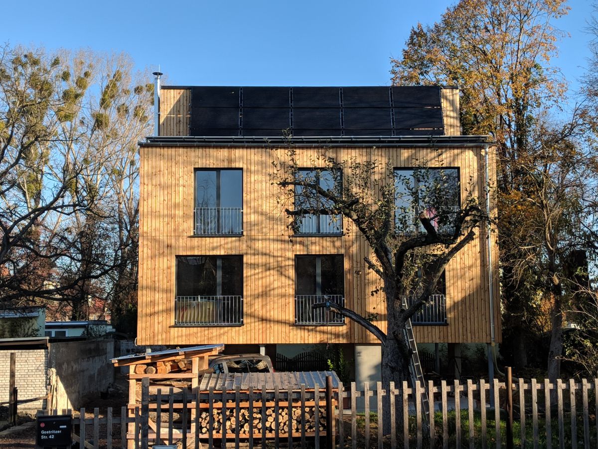 Die Dämmung ist aus Holzweichfaserplatten. Im Spitzdach und im unteren Boden ist Holzweichfaserdämmung eingeblasen. Die Fassade ist eine hinterlüftete Holzfassade aus naturbelassenem Lärchenholz, dahinter liegt eine diffusionsoffene Windsperre.