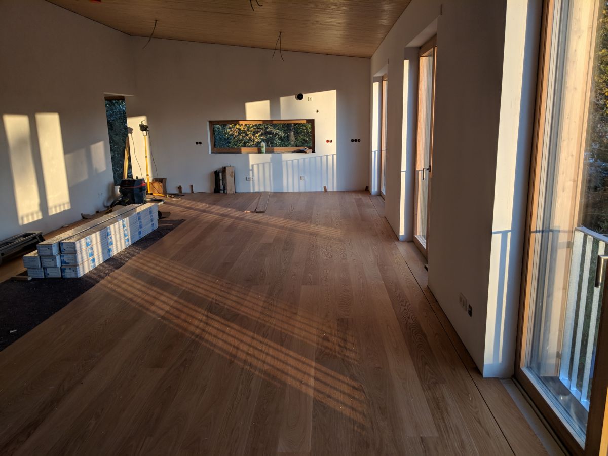 Eine Fußbodenheizung im Trockenestrich verteilt die Wärme im ganzen Haus über eine große Fläche mit niedriger Temperatur. Die Einzelraumregelung wird dabei nicht genutzt.